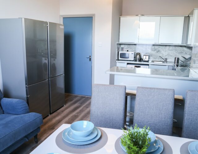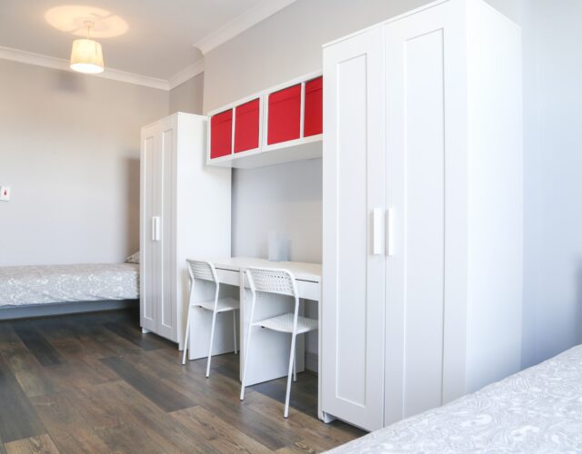 – Comfortable and fully furnished room with 3 desks, 3 wardrobes;